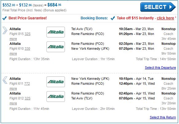 You can currently snag a roundtrip ticket from Tel Aviv Israel to New York City for just $684 roundtrip on Alitalia Airlines! This is a great deal for those preferring a western carrier.