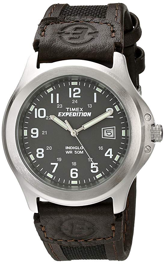 “While it looks like a casual watch, the full-sized Timex Men’s T40051 Expedition Metal Field Brown Leather Strap Watch adds a stylish yet rugged complement to your everyday wear. It features a large, round silver-tone brass watch case with a flattened, brushed bezel that frames an olive green dial background with Arabic numerals, inset 24-hour notations, large, luminous stick hands (with seconds hand), and a date display at 3 o’clock. With the Quick Date function, you can set the date on the watch without turning the crown for every 24-hour period. Just pull the stem halfway out, and turn until desired date is reached. It also offers an 8-year battery life, water resistance to 165 feet (50 meters), and a durable genuine leather strap. The Indiglo night-light uniformly lights the surface of the watch dial using patented blue electroluminescent lighting technology. It uses less battery power than most other watch illumination systems, enabling your watch battery to last longer.”