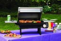 - Folding side shelves; temperature gauge; propane tank not included