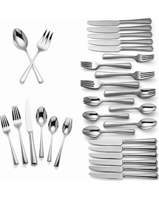 - Set includes: Twelve place forks, Twelve place knives, Twelve salad forks, Twelve Forks, Twelve place spoons, Twelve teaspoons, Tablespoon and a Serving fork