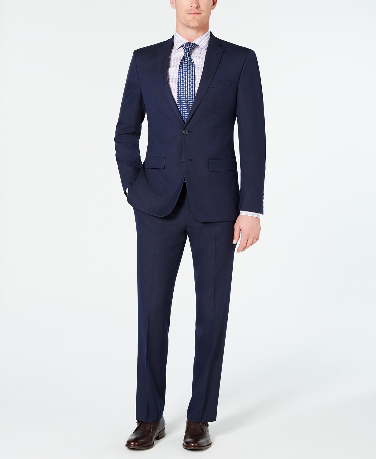 “Update your sophisticated essentials with the polished pindot pattern and wrinkle-resistant stretch fabric of this dark blue slim-fit suit from Van Heusen.”
