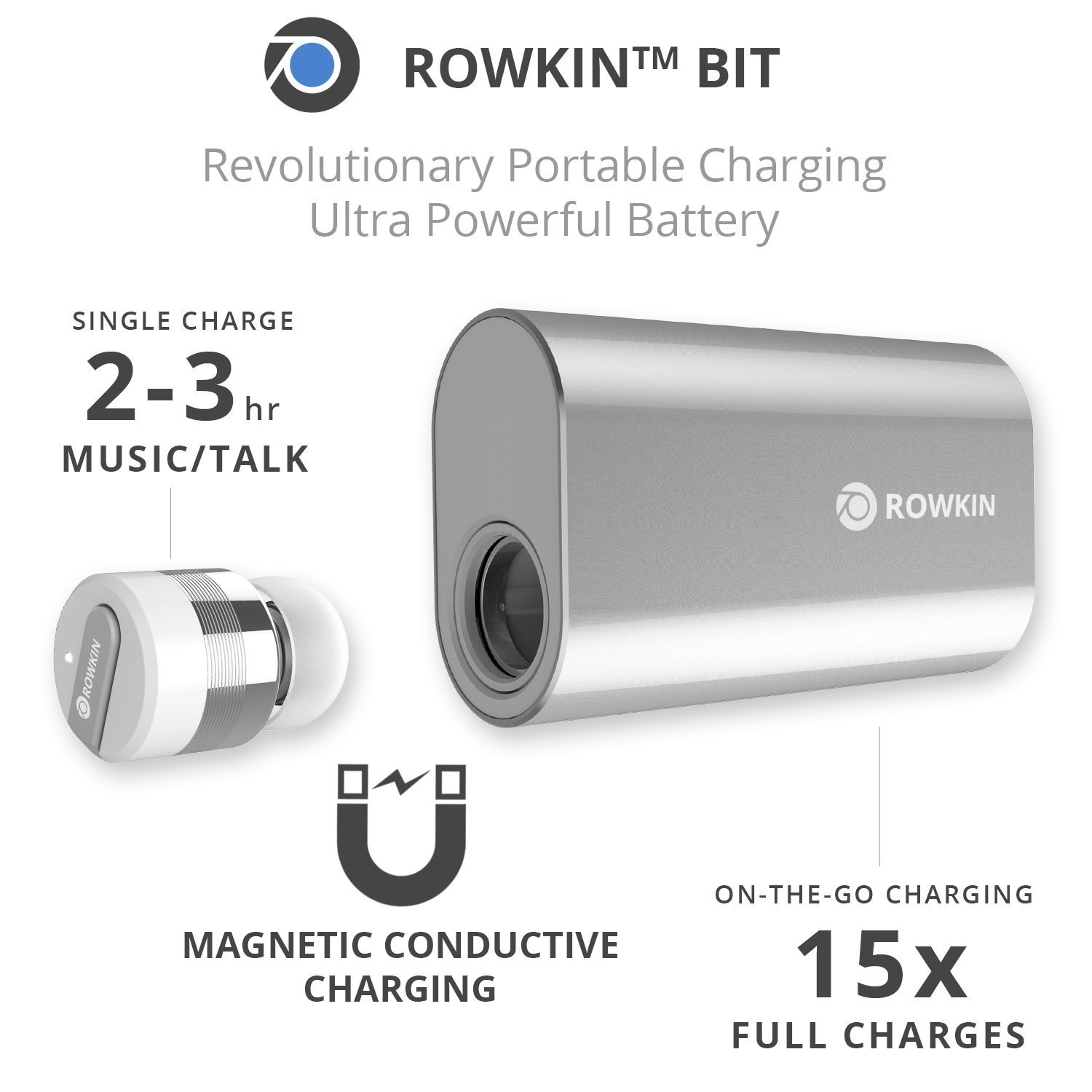 - With the compact conductive portable charging system, your Rowkin Bluetooth earbud will never run out of battery. The dual-function portable charger allows you to charge your wireless earbud up to 30 times and serves as a power bank for your other mobile devices.