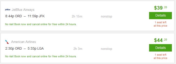 You can currently snag flights on select dates from New York to Chicago, or vice versa from Chicago to New York for just $39.20 – $44.20 each way! Flights are on either JetBlue, United or American airlines, depending on the date.