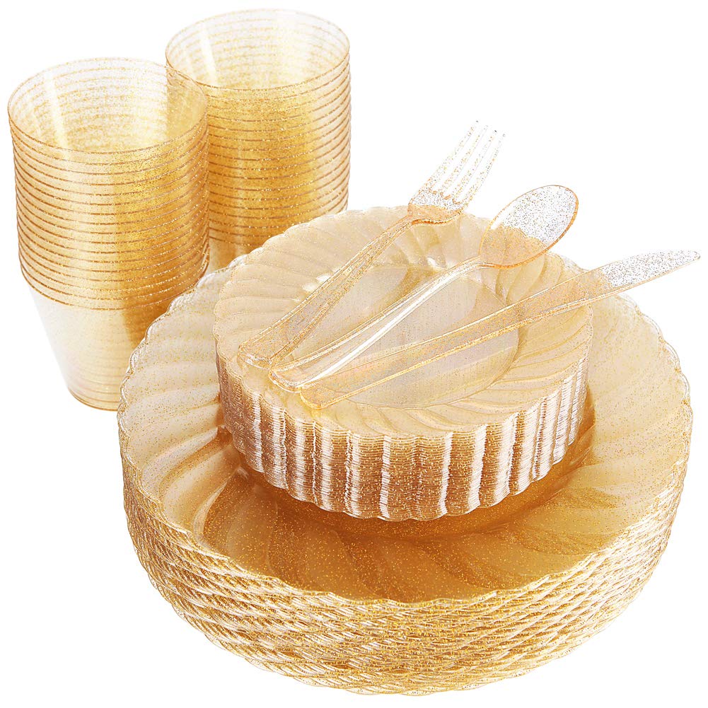 - PACKAGE INCLUDES: WDF Gold glitter dinnerware set includes 25 Dinner Plates,25 Salad Plates,25Forks, 25 Knives, 25 Spoons& 9OZ Plastic Cups. Idea for 25 guests, sturdy construction resists breakage, bending, and snapping.