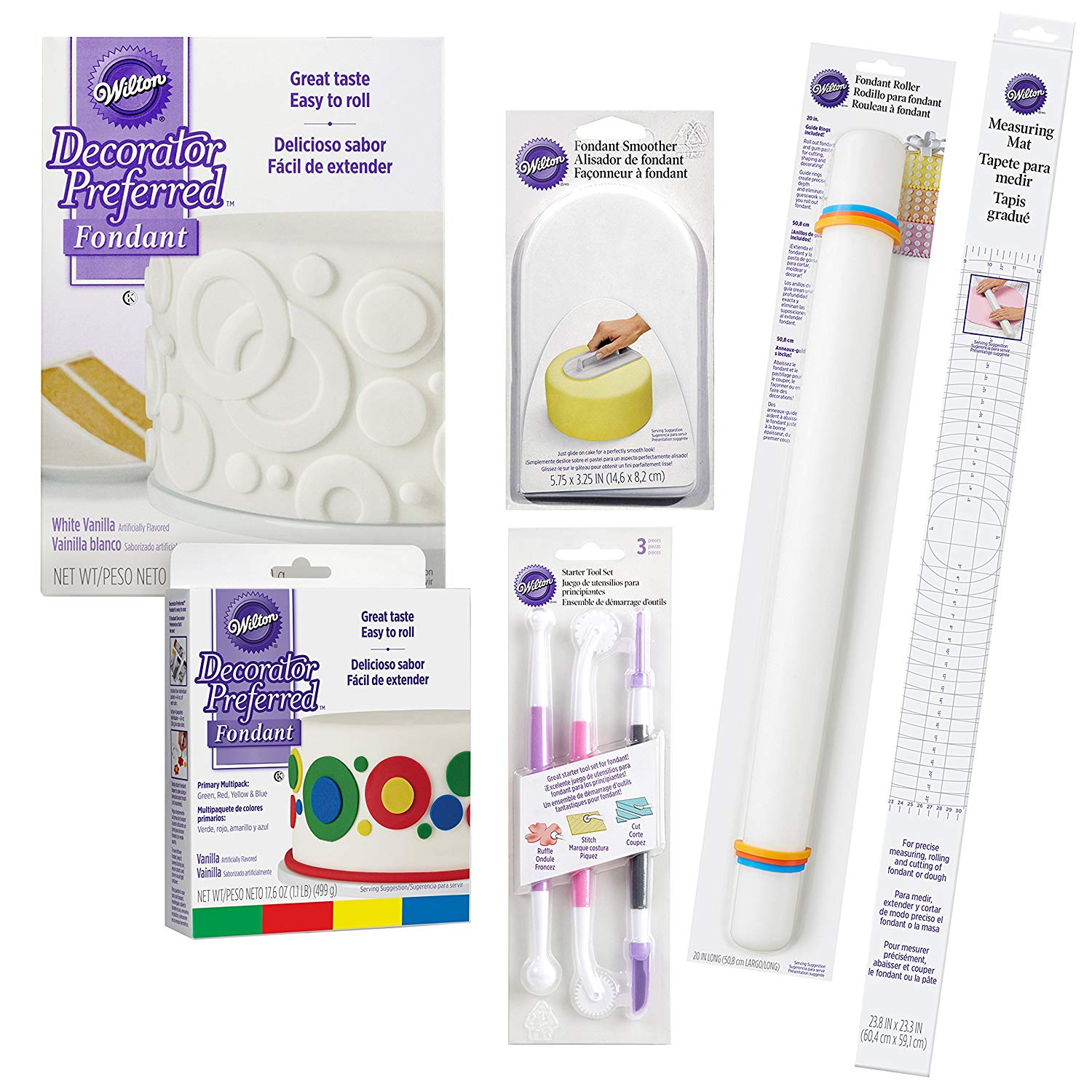 - Includes: White fondant, 4-pack of primary colors fondant, 20-inch roller with guide rings, measuring mat, fondant smoother and 3-piece tool set