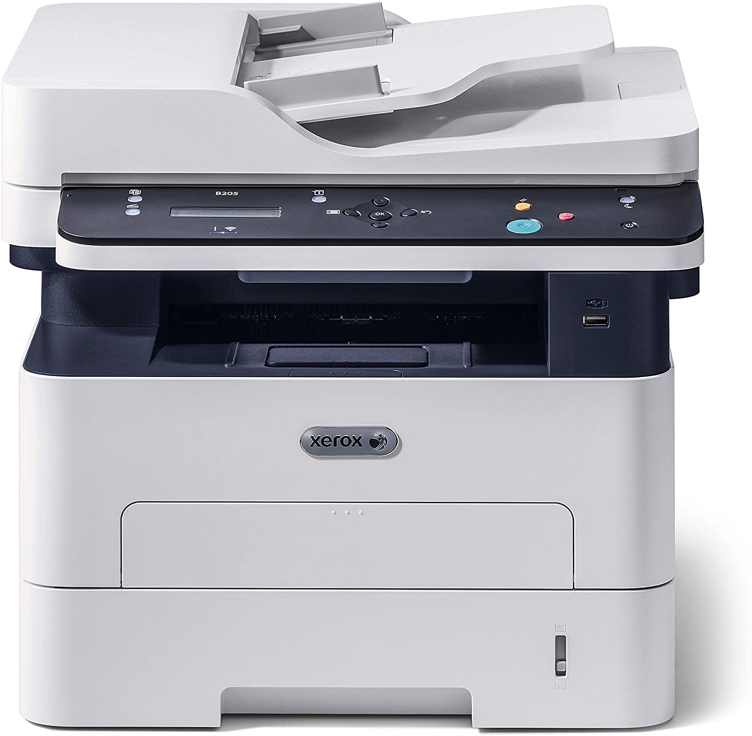 - Xerox B205NI is a lightweight, compact, quiet black and white multifunction printer offering print/copy/scan and standard wireless connectivity, 2-line LCD user interface, 40-sheet Automatic Document Feeder, Standard Paper Capacity of 250 sheets/1 sheet manual feed slot while printing on a wide assortment of media types plain, thick, thin, cotton, colored, pre-printed, recycled, transparency, label, cardstock, bond and archive