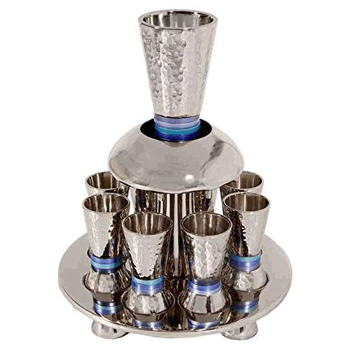 Yair Emanuel Hammered Nickel Kiddush Fountain with Cone Shaped Cups – Blue Rings – Link