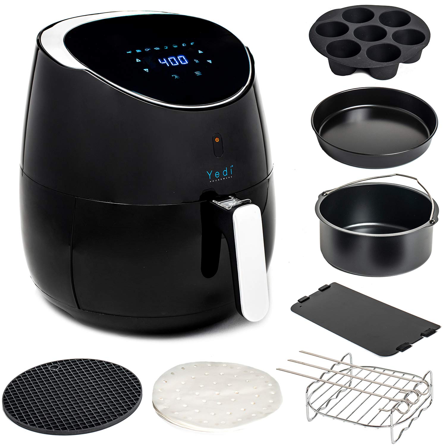 - TOTAL PACKAGE XL AIR FRYER: The Yedi Houseware 5.8 Quart XL Air Fryer comes with everything you need and can feed the entire family! On the digital touch screen you can set your desired cooking time and temperature when making food. Or select from the built-in smart programs: fries, chops, shrimp, baked goods, chicken, steak and fish.